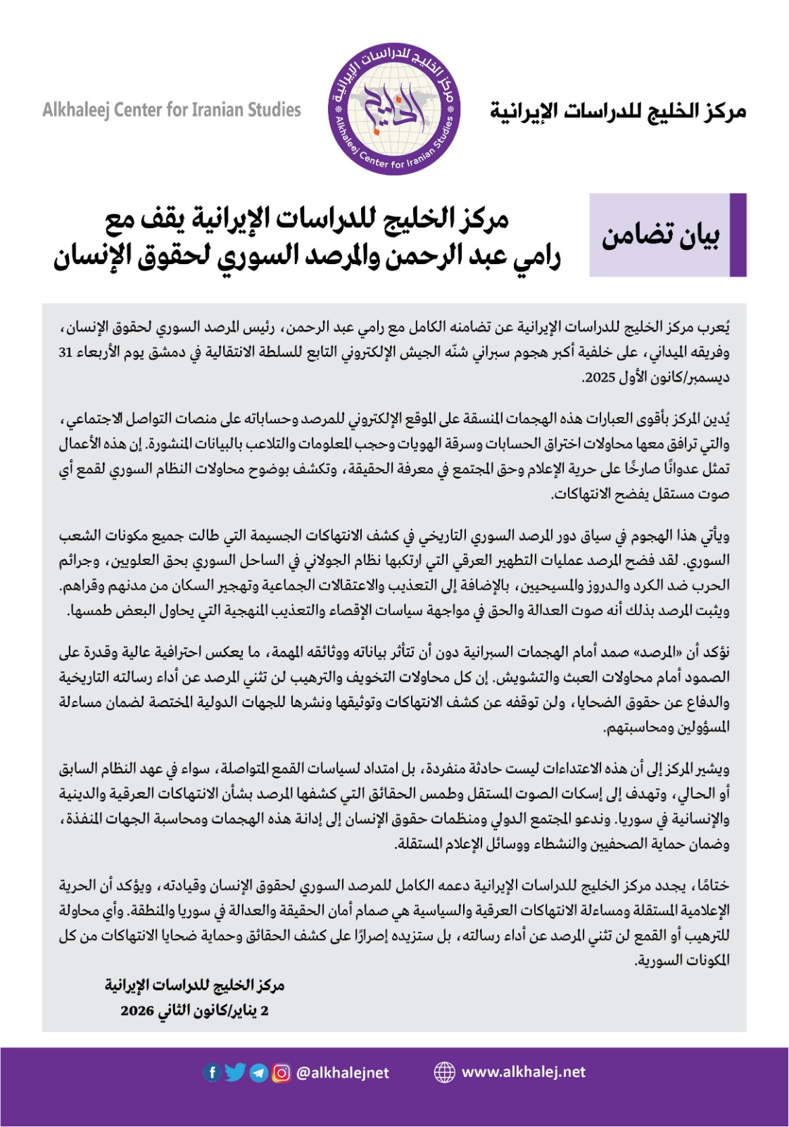 يُعرب مركز الخليج للدراسات الإيرانية عن تضامنه الكامل مع رامي عبد الرحمن، رئيس المرصد السوري لحقوق الإنسان، وفريقه الميداني، على خلفية أكبر هجوم سبراني شنّه الجيش الإلكتروني التابع للسلطة الانتقالية في دمشق يوم الأربعاء 31 ديسمبر/كانون الأول 2025.