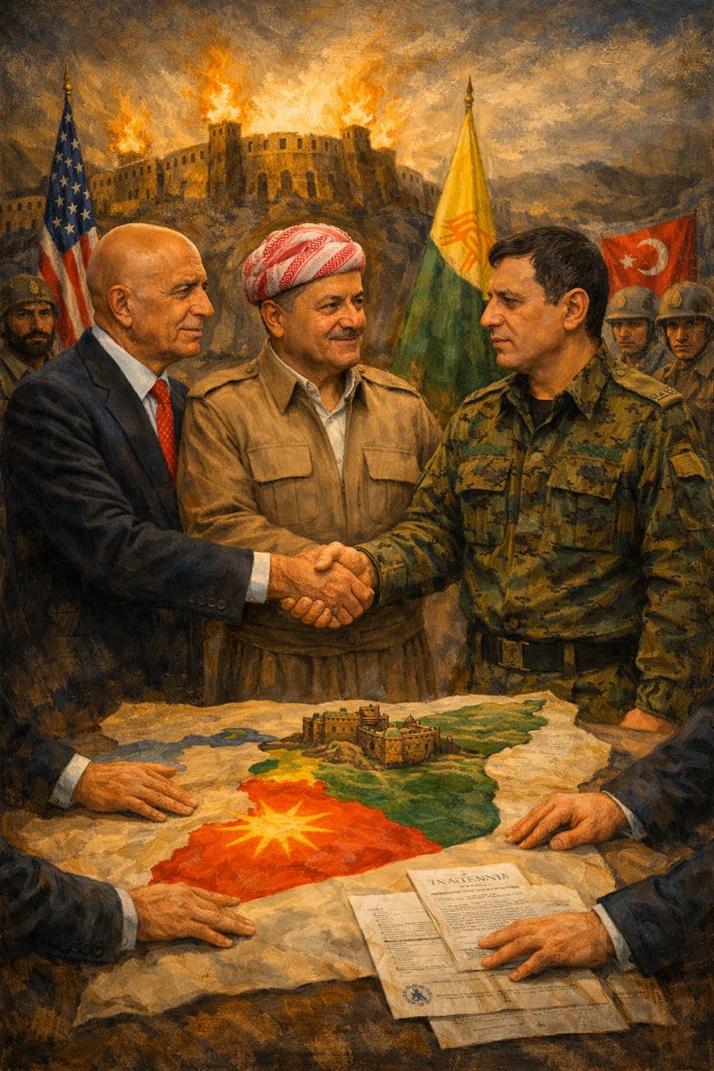 بين مطرقة الجغرافيا السياسية القاسية وسندان التحولات الدولية المتسارعة، تقف الحركة الكردية في سوريا اليوم أمام أخطر اختبار وجودي في تاريخها المعاصر. فلقاء أربيل المفصلي، الذي جمع قائد قوات سوريا الديمقراطية مظلوم عبدي بالمبعوث الأمريكي توم باراك، تحت مظلة المرجعية القومية التي يمثلها الرئيس مسعود البرزاني، لا يمكن قراءته بوصفه اجتماعًا بروتوكوليًا عابرًا، بل يمثل إعلانًا صريحًا عن نهاية مرحلة «الغموض الاستراتيجي» والدخول في زمن «الحلول الصعبة».