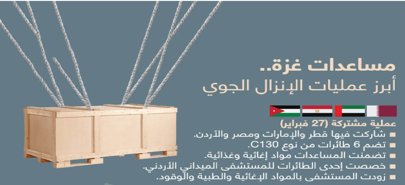الإنفوجرافيك، يرصد أبرز عمليات الإنزال الجوي في القطاع، وحجم المساعدات التي أنزلت، وعيوب هذه العمليات.