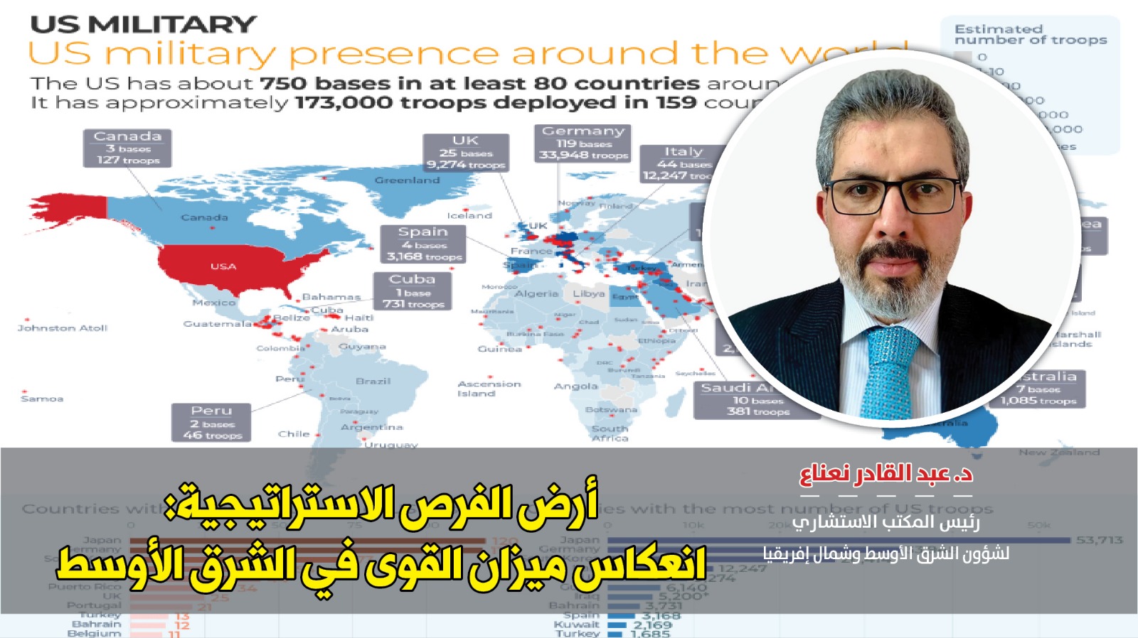 هذه المبادئ والآليات، وما رافقها من أحداثها، سمحت للولايات المتحدة بتأسيس قواعد عسكرية في خمسة عشر دولة عربية (9) –بغض النظر عن حجم هذه القواعد ومهامها وطول مدتها–، إلى جانب قواعدها في تركيا وإسرائيل وأفغانستان، لضبط الشرق الأوسط (انظر الخريطة). عدا عن أن سبع دول عربية (10) هم حلفاء للولايات المتحدة من خارج الناتو Non-NATO Allies إلى جانب إسرائيل (الحليف الاستراتيجي الرئيس منذ 2014)، من أصل ثمانية عشر حليفاً في ذات التصنيف. بينما تعتبر البحرين والإمارات شركاء أمنيين رئيسين للولايات المتحدة. وتضم قطر القاعدة المتقدمة للقيادة العسكرية الأمريكية لمنطقة الشرق الأوسط ووسط آسيا (CENTCOM). وترتبط الولايات المتحدة باتفاقيات تجارة حرة مع أربع دول عربية (11) وإسرائيل، من أصل عشرين اتفاقية تجارة حرة أمريكية حول العالم. وتشمل اتفاقيات الاستثمار المشترك خمس دول عربية (12) وتركيا. وتمتلك الولايات المتحدة اتفاقيات تأطيرية تجارية واستثمارية مع كل دول الشرق الأوسط باستثناء سورية وإيران. وتعتبر السعودية أكبر مشترٍ للسلاح الأمريكي على مستوى العالم. فيما تكلفت حروب الولايات المتحدة في العراق وسورية وأفغانستان وباكستان، قرابة 6.4 تريليون دولار، مضافاً إليها 2 تريليون دولار دفعات فوائد حتى عام 2030 (13).