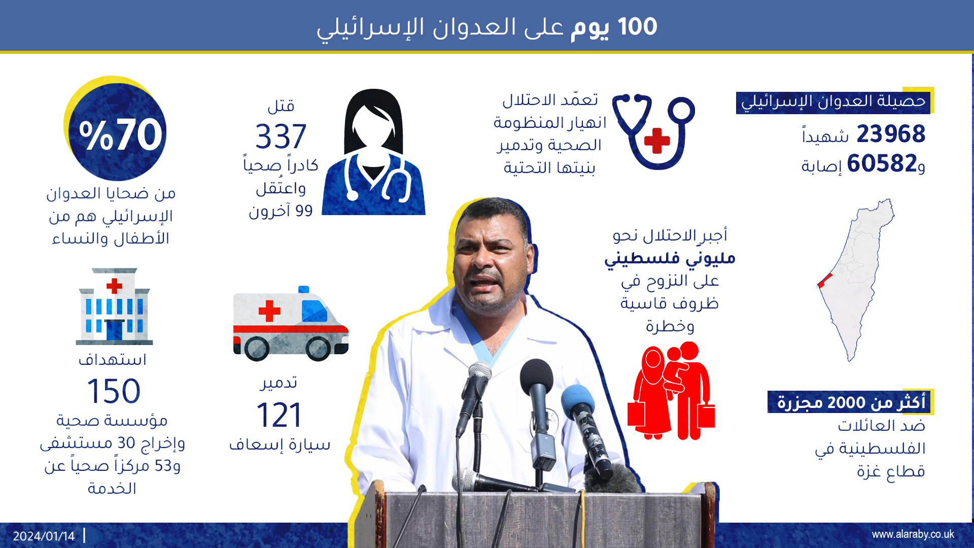 حسب تصريحات أشرف القدرة، المتحدث باسم وزارة الصحة، فإن حصيلة 100 مئة يوم من العدوان الإسرائيلي ناهزت 24 ألف شهيد ارتقوا خلال أكثر من 2000 مجزرة، لا يبدو أنها كافية كي تعتبر دول عدة في العالم أن ما تقترفه إسرائيل في حربها على غزة "إبادة جماعية".