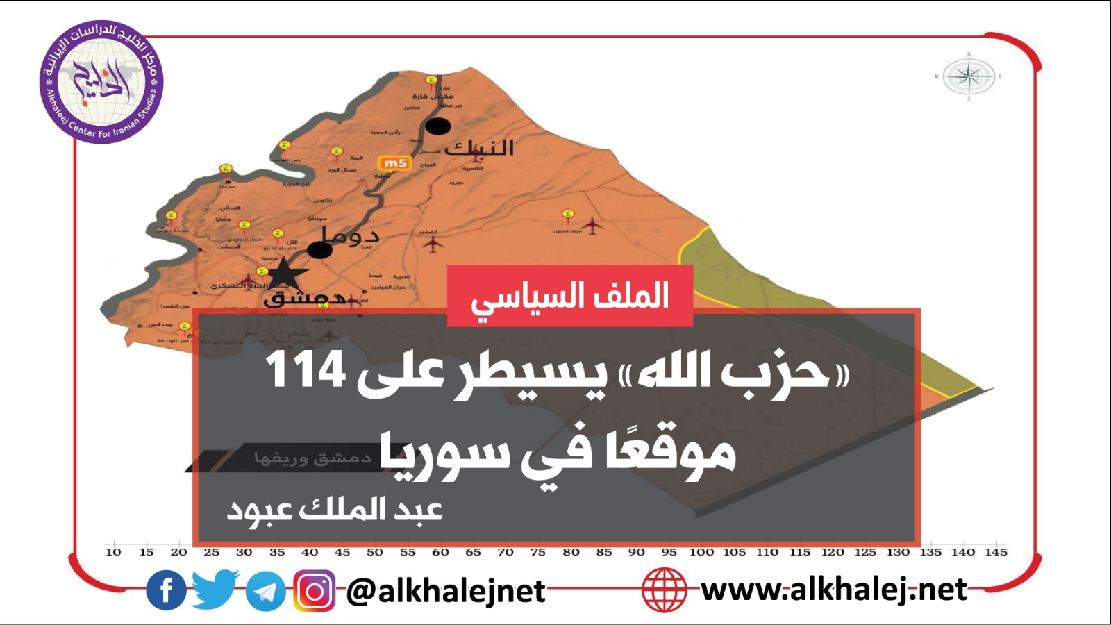 خريطة التوزع العسكري لـ "حزب الله" تظهر نوايا قيادة الميليشيات الموالية لإيران في تحقيق مكاسب على الأراضي السورية كما إيران وروسيا، إذ تنتشر الميليشيا بمحاذاة الطريق الدولي ( M-5 أوتوستراد حلب- دمشق) وطريق الترانزيت الواصل بين أوربا ومنطقة الخليج العربي، بداية من دوار الليرمون في حلب شمالًا وصولًا إلى معبر نصيب على الحدود الأردنية، مرورًا بكافة مداخل مراكز المحافظات السورية والعقد المرورية الهامة والجسور والتقاطعات.