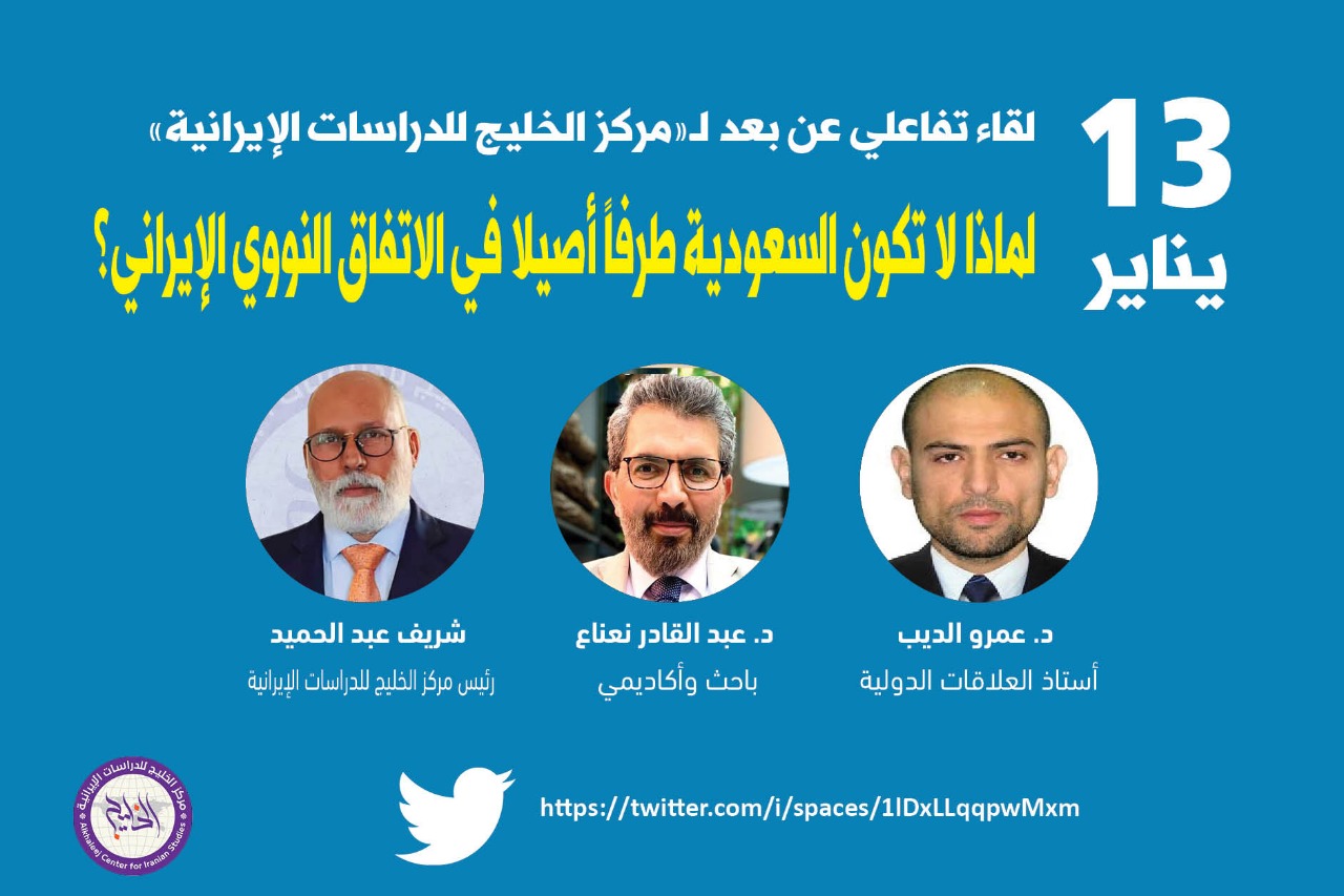 عقد "منتدى الخليج" التابع لمركز الخليج للدراسات الإيرانية مساء اليوم الخميس 13/1/2022 ندوة افتراضية بعنوان: لماذا لا تكون السعودية طرفًا أصيلًا في الاتفاق النووي الإيراني؟